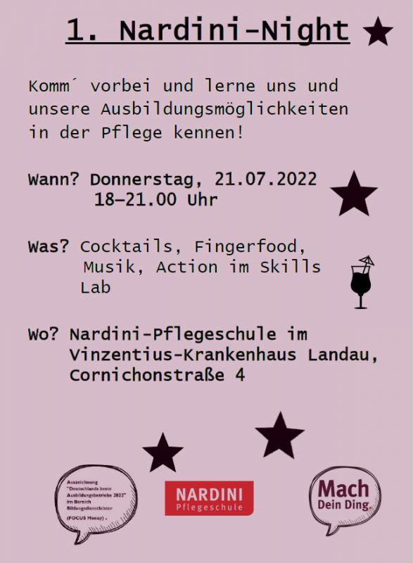 Die 1. Nardini-Night: Am 21.07. ist es soweit! Kommt vorbei und lernt die Nardini-Pflegeschule und die Ausbildungsmöglichkeiten in der Pflege kennen. Los geht´s ab 18.00 Uhr.