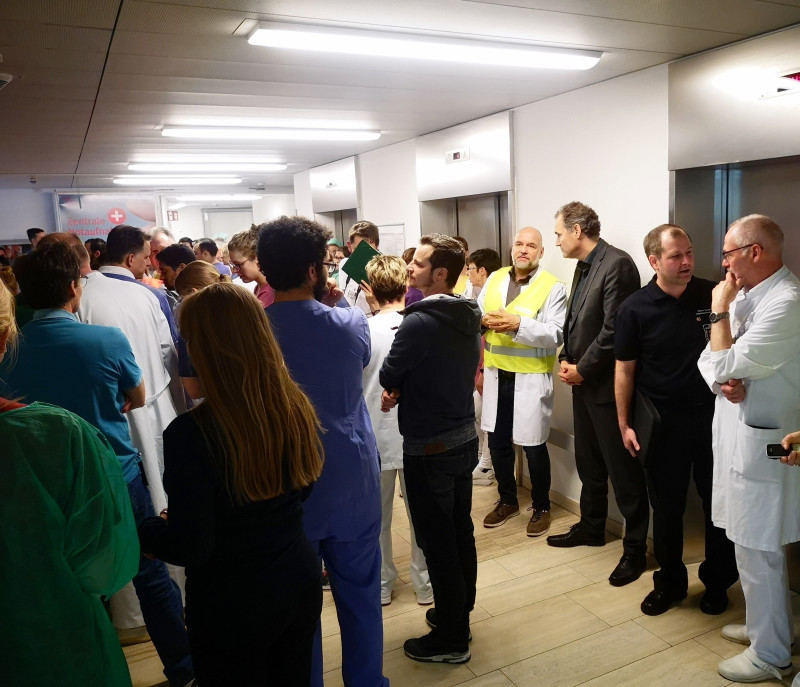 Auch bei der Übung kommen immer mehr Ärzte und Pflegekräfte ins Foyer. Schnell werden dort aus den über 100 nach dem Alarm erschienenen Kräften 60 Helfer koordiniert. 15 Minuten nach dem Alarm wird der erste fiktive Patient eingeliefert. Keine echte Person. Auf einem Blatt Paper ist lediglich die Schwere der Verletzung notiert. Entsprechend wird gehandelt: Ein Ärzte- und Pflegeteam wird zusammengestellt und einem Raum zugeordnet. Später sieht das Szenario vor, dass ein Operationsaal benötigt wird. Auch hier wird ein Helferteam beauftragt.
