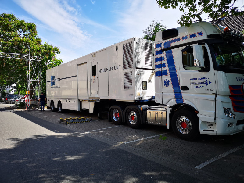 Was wird unternommen, um den Krankenhaus-Patienten die schonende und wertvolle Diagnostik weiterhin zu ermöglichen? Geschäftsführerin Ilona Fleischer-Klisch betont „am Vinzentius-Krankenhaus in Landau geht man neue Wege und lässt bis zur Wiederinbetriebnahme des regulären MRTs im Haupthaus für die kommenden Wochen ein mobiles MRT auf Sattelschlepper vor dem Gebäude aufstellen.“ Der vollständig geschirmte Aufbau ermöglicht es die geplanten Untersuchungen fortzuführen. Dazu begeben sich die Patienten statt zur Radiologie zu dem riesigen Sattelschlepper auf den eigens dafür gesperrten Parkflächen vor der Kinderklinik. „Der Anschluss des mobilen MRT an das Bildsystem der Radiologie im Krankenhaus garantiert den untersuchten Patienten die gleiche Qualität in der Diagnostik wie bisher, nur der Weg dahin ist vorrübergehend verändert,“ erklärt Oberarzt Dr. Taha Safi. Die Spannung und Erwartung vor dieser Untersuchung bei den Patienten wird sicher durch den Einsatz dieses besonderen mobilen Großgerätes einen eigenen Stellenwert erhalten.