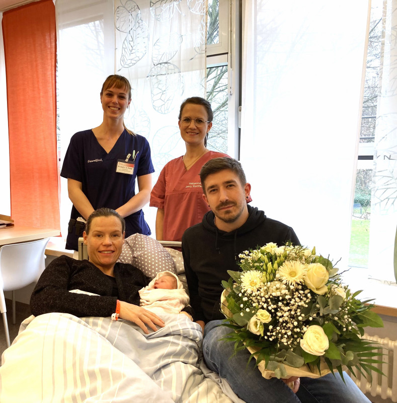 Oberärztin Frau Yükselen und Assistenzärztin Dr. med. Lena-Sophie Prange, sowie die Hebamme Jennifer Stuhlfauth begleiteten die Geburt von Marie Eleonore und gratulierten den frisch gebackenen Eltern und überreichten einen Blumenstrauß für die Mama.